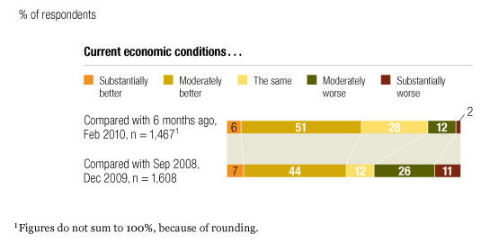 However, on some other measures, this optimism is tempered and has declined slightly since December. The share expecting economic conditions to be “substantially” or “moderately better” at the national level at the end of June 2010, for example, has fallen to 59 percent, from 69 percent (Exhibit 4).